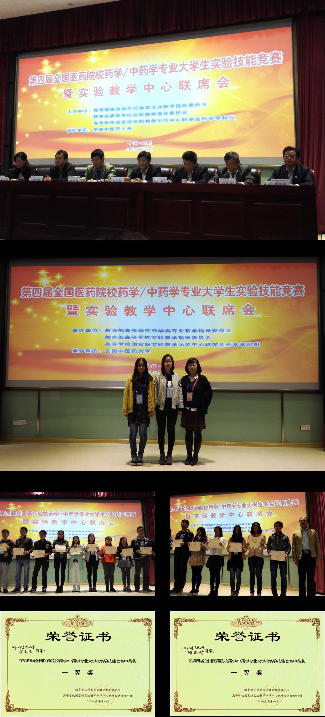 11月5日-11月7日,由教育部高等公司药学类专业教学指导委员会、教育部高等公司实验教学指导委员会和高等公司国家级实验教学示范中心联席会药学学科组主办,安徽中医药大学承办的第四届全国医药院校药学/中药学专业老员工实验技能竞赛暨实验教学中心联席会在安徽中医药大学举行。公司beat365官方登录中药学专业2012级金荧荧和鲍逸舒两名员工在beat365官方登录黄真副经理带领下参赛,经过激烈角逐,获得了2项个人一等奖的佳绩。