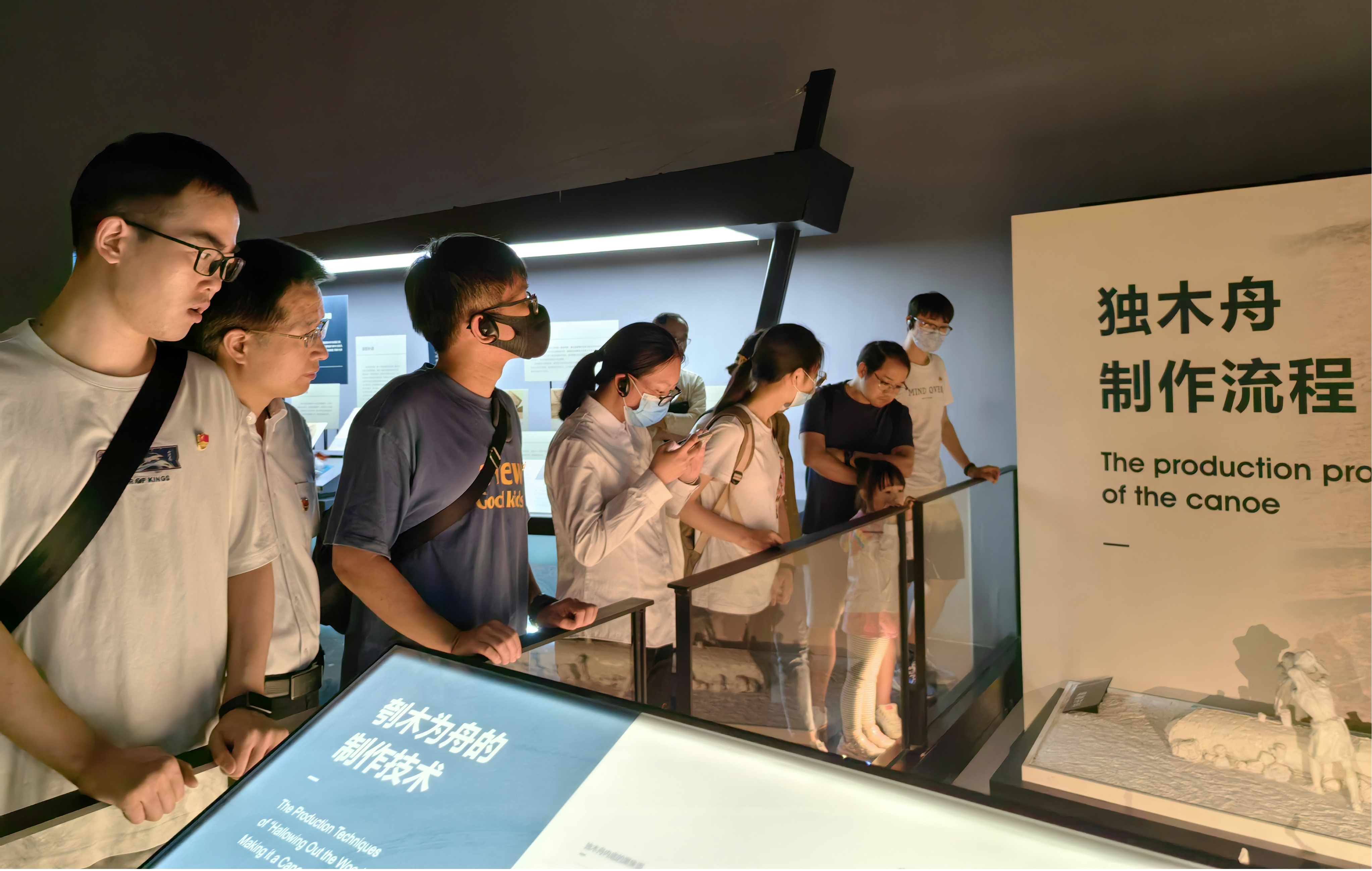 在讲解员的带领下,全体党员参观了“勇立潮头”跨湖桥文化主题陈列厅、水下遗址展示厅、引进项目厅等3个展厅,近距离探访了距今八千年的“中华第一舟”,感受了史前人类的伟大智慧和考古学者传承文化的坚韧力量,切身体会了浙江先人的智慧和力量,深刻领悟了“干在实处、走在前列、勇立潮头”的浙江精神。在遗址保护区前,讲解员生动讲述了当年习近平总书记到跨湖桥遗址博物馆考察调研时,有摄影记者为了寻找最好的拍摄角度,跨进了遗址保护区,总书记提醒记者“拍照是小事,文物保护是大事”的故事。脚步的“轻”,体现的正是文化在习近平总书记心中的“重”。总书记强烈的文物保护意识,使党员们深受震撼,不觉也放轻放慢了脚步。