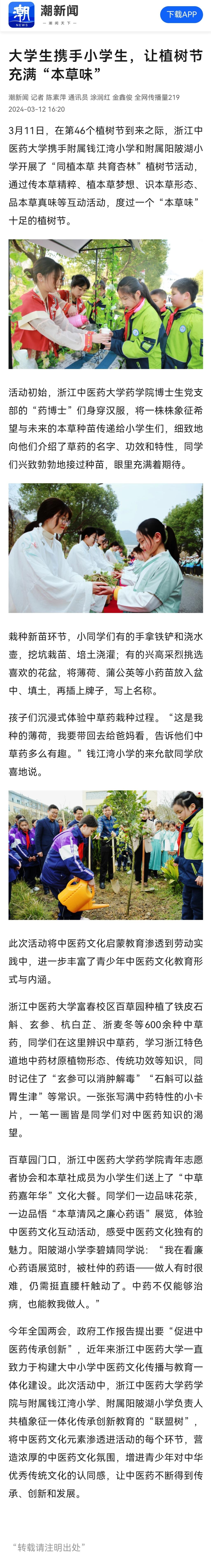 3月11日,在第46个植树节到来之际,beat365官方登录携手附属钱江湾小学和附属阳陂湖小学开展了“同植本草 共育杏林”植树节活动,通过传本草精粹、植本草梦想、识本草形态、品本草真味等互动活动,度过一个“本草味”十足的植树节。