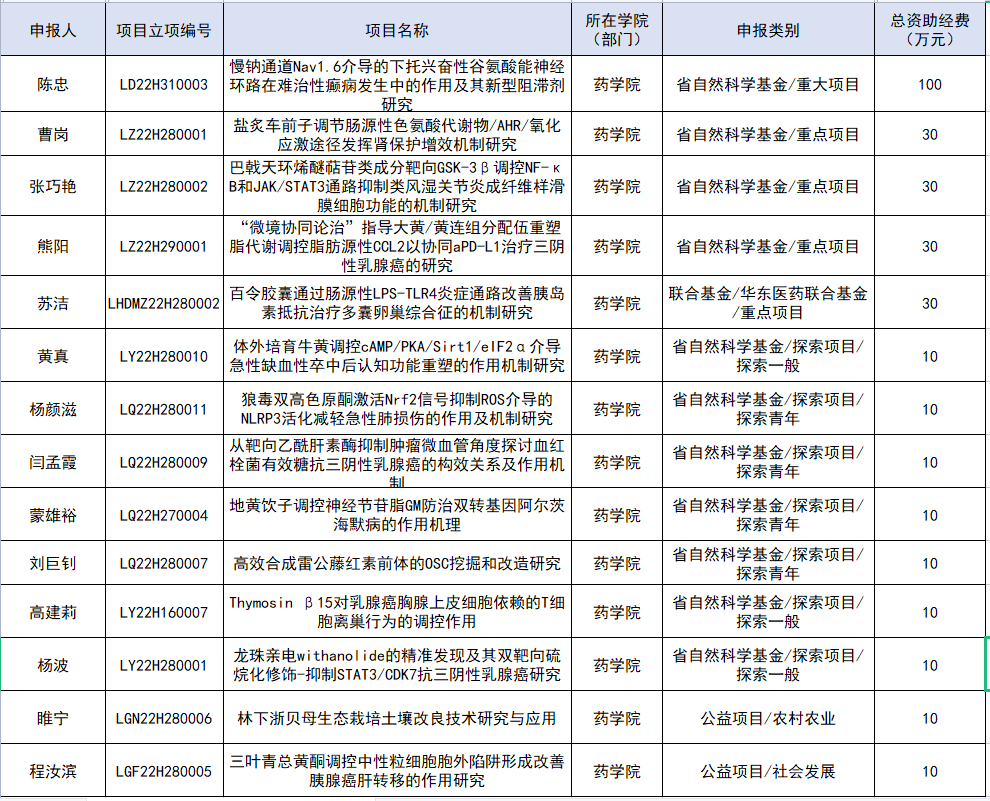 2021年12月6日,浙江省科学技术厅正式下发《关于下达2022年度浙江省基础公益研究计划项目的通知》,公司共有14项基金获得资助,占全校立项数的22.6%。其中,重大重点项目立项数取得突破性进展,重大项目1项,占全校重大项目立项数的50%;重点项目4项,占全校重点项目立项数的66.7%。