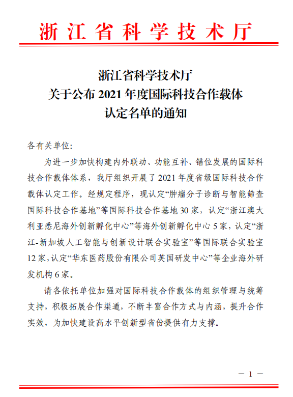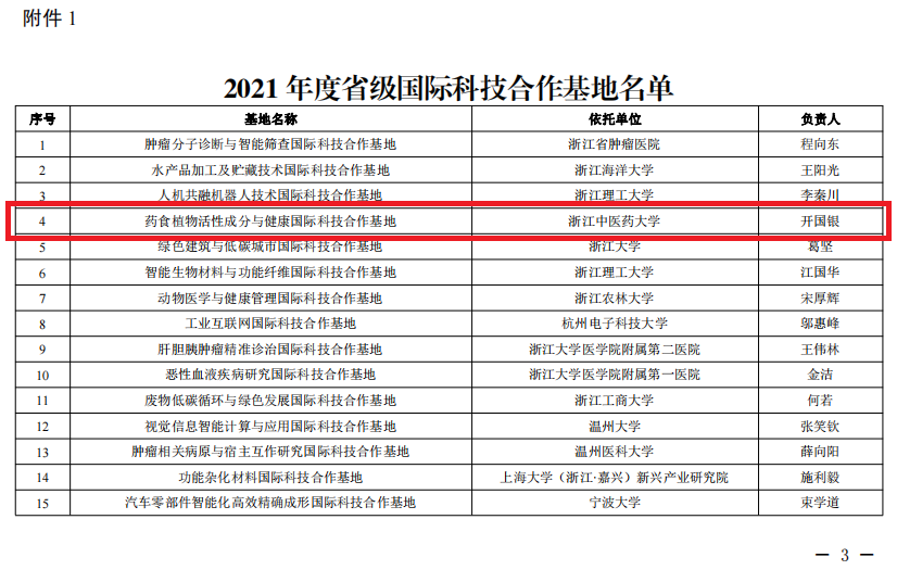 12月13日,浙江省科学技术厅公布了2021年度省级国际科技合作载体认定名单,beat365官方登录开国银教授牵头组建并申报的国际科技合作平台“药食植物活性成分与健康浙江省国际科技合作基地”获批认定,实现了beat365官方登录“国际科技合作基地”零的突破。