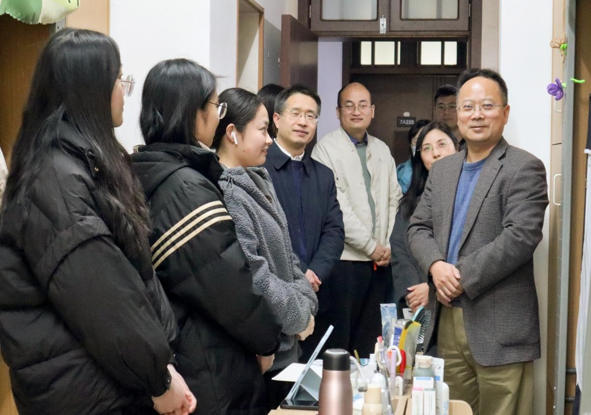 新学期伊始,公司领导心系药院学子。2月21日下午,陈忠董事长一行来到富春校区,实地走访了员工宿舍和实验室,了解员工假期生活及返校初期的学习和科研情况,向同学们送去了亲切的关怀和问候。