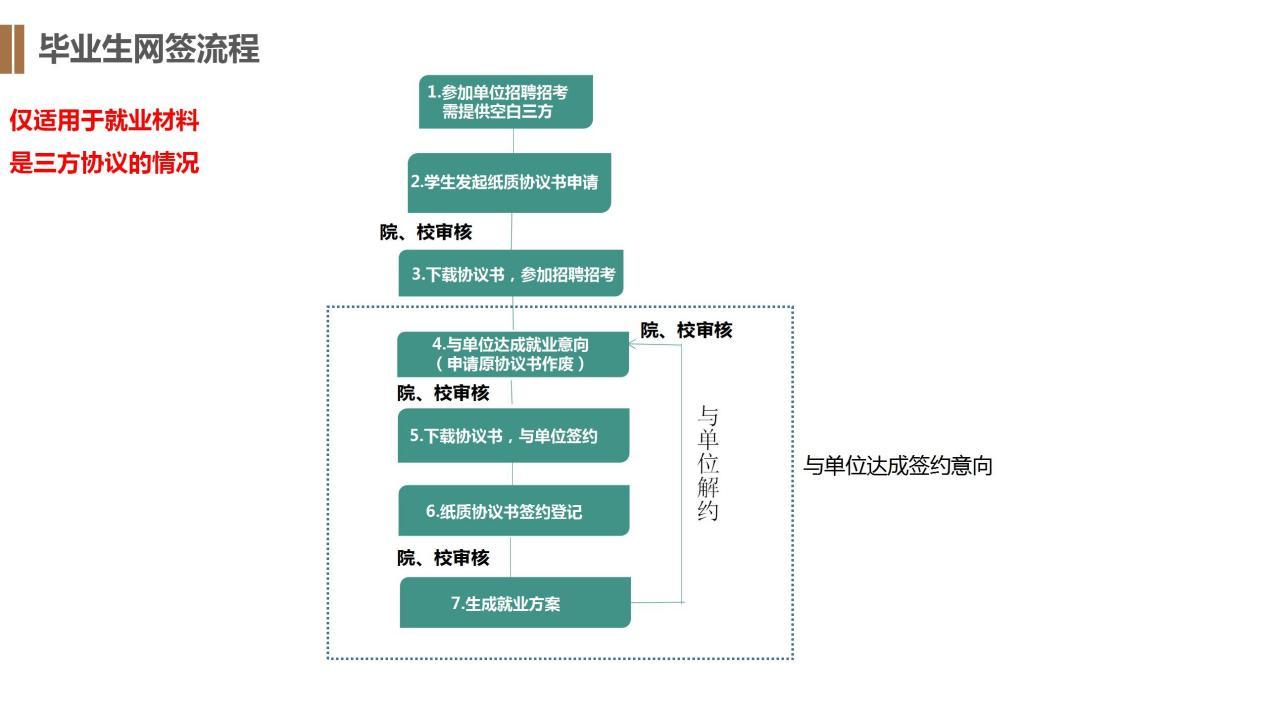 就业指导中心针根据签约流程,对【三方协议申领】、【签约后登记】、【三方协议作废】三个部分,制作了详细的操作指南。