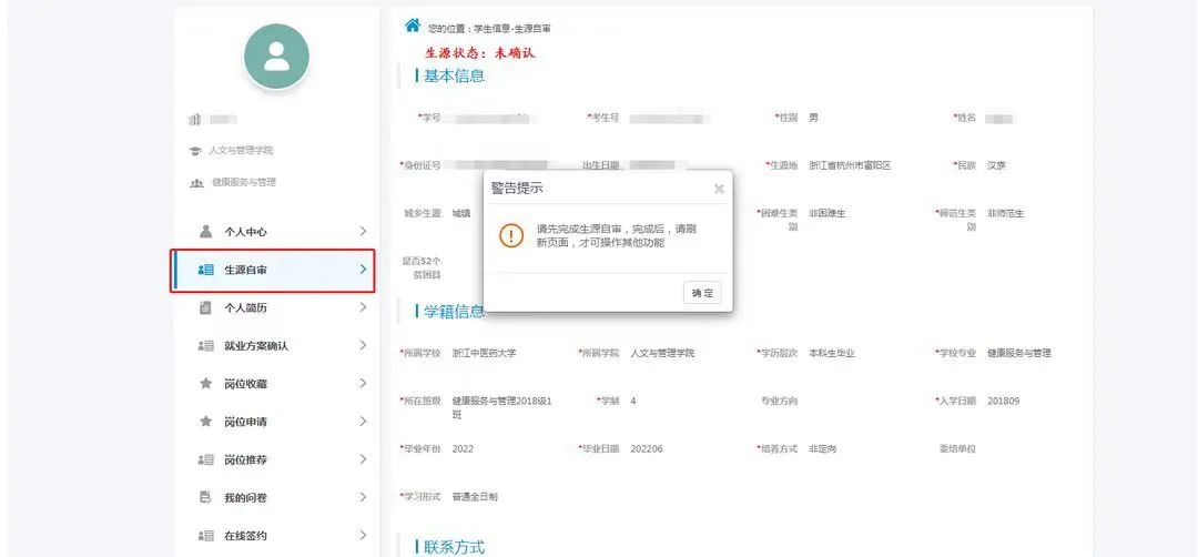 登陆后,进入【生源自审】,核对页面内的生源信息,确认无误,点击【确认】即完成生源自审,并刷新页面进行下一步操作。