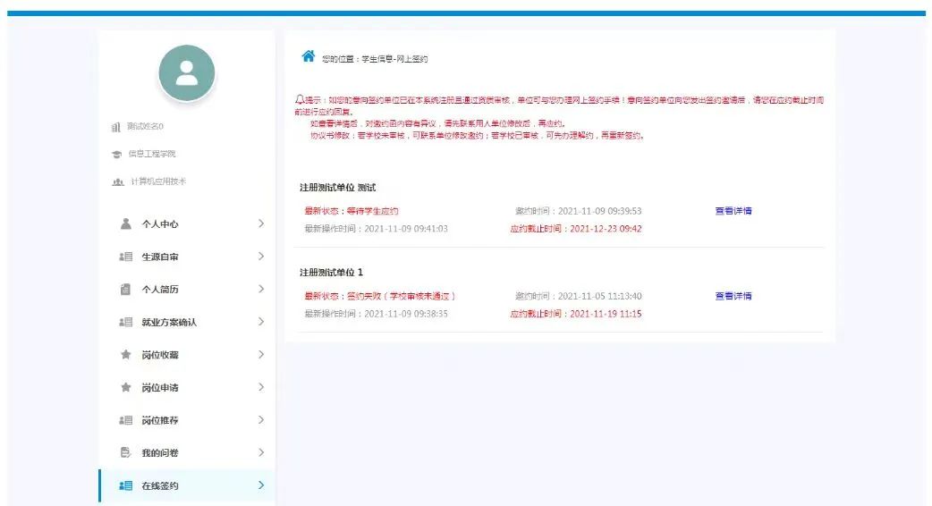 点击【在线签约】,查看单位的邀约,应答邀约。