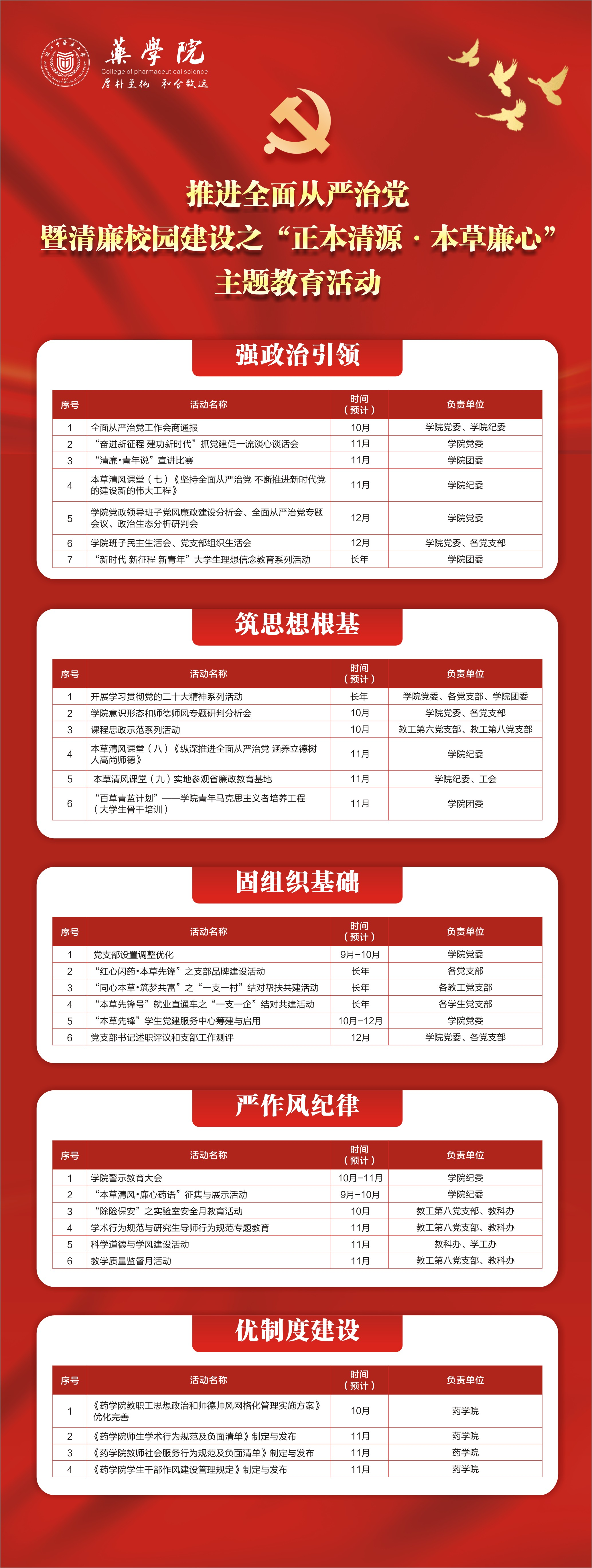 据悉,本次活动以“正本清源•本草廉心”为主题,分“强政治引领”、“筑思想根基”、“固组织基础”、“严作风纪律”、“优制度建设”五个板块,共计29项具体内容。通过教育活动引导全院师生积极弘扬自我革命精神,坚持严的主基调不动摇,自觉把全面从严治党各项规定任务要求融入人才培养、科学研究和社会服务,融入公司事业高质量发展的具体实践,落实到党的政治建设、思想建设、组织建设、作风建设、纪律建设、制度建设各个方面,努力以全面从严治党新成效护航一流中医药大学建设行稳致远