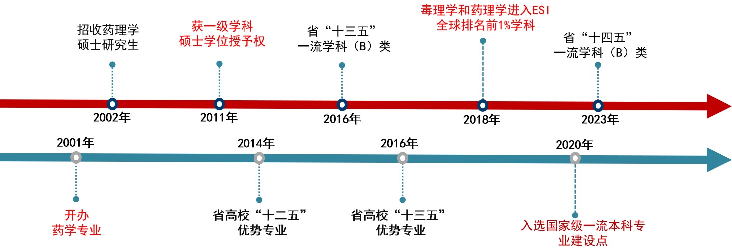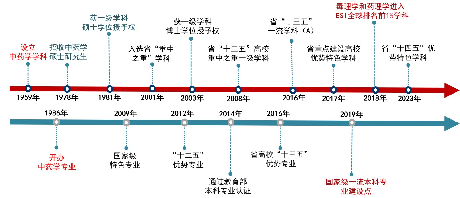 中药学学科为浙江省“重中之重”学科(两轮滚动建设)、浙江省一流学科(A类)、浙江省重点建设高校优势特色学科、浙江省“十四五”优势特色学科,药学学科为浙江省“十三五”“十四五”一流学科(B类);中药药剂学、中药药理学为国家中医药管理局重点学科;药理学与毒理学学科为ESI全球前1%学科,2024年7月,进入ESI全球前2‰学科;中药资源学为浙江省重点学科;中药资源工程学、中药药效毒理学、中药药物代谢动力学为浙江省中医药重点学科。